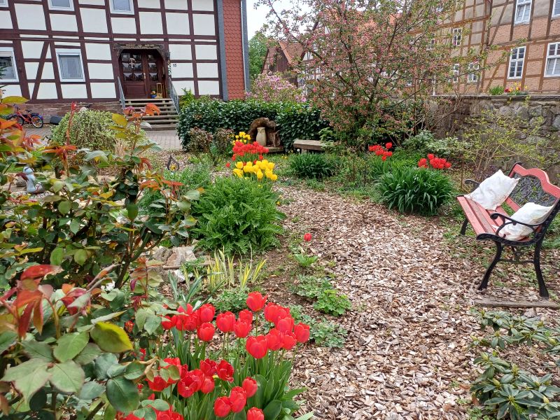 Zwischen Obstbäumen, Beerensträuchern, Feigen, Kiwi. Hecken- und Kletterpflanzen, Gingko, Amber- und Trompetenbaum fühlen Sie Sie sich wohl .