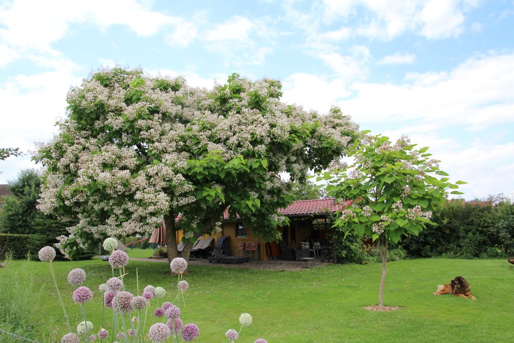 Zwischen Obstbäumen, Beerensträuchern, Feigen, Kiwi. Hecken- und Kletterpflanzen, Gingko, Amber- und Trompetenbaum fühlen Sie Sie sich wohl .